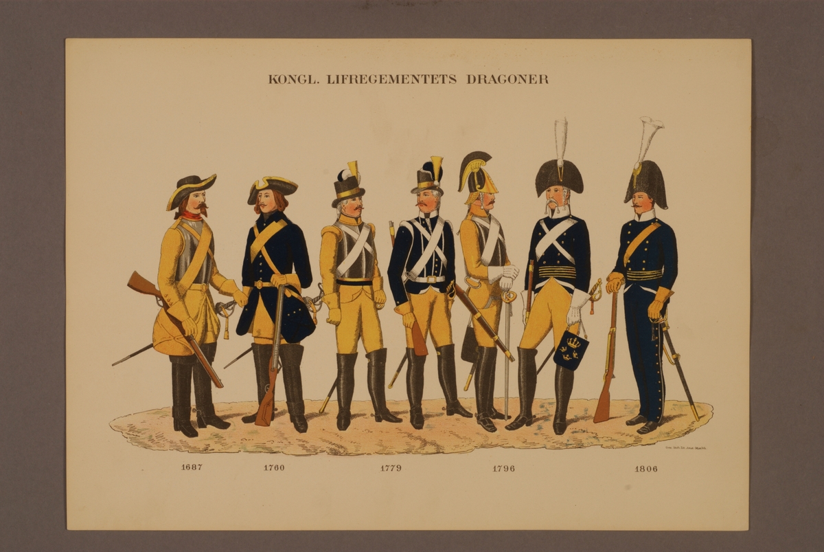 Plansch i färgtryck med uniform för Livregementets dragoner för åren 1687-1806. Ingår i planschsamlingen Svenska krigsmaktens fordna och nuvarande munderingar utgiven av P.B Eklund 1900-1905.