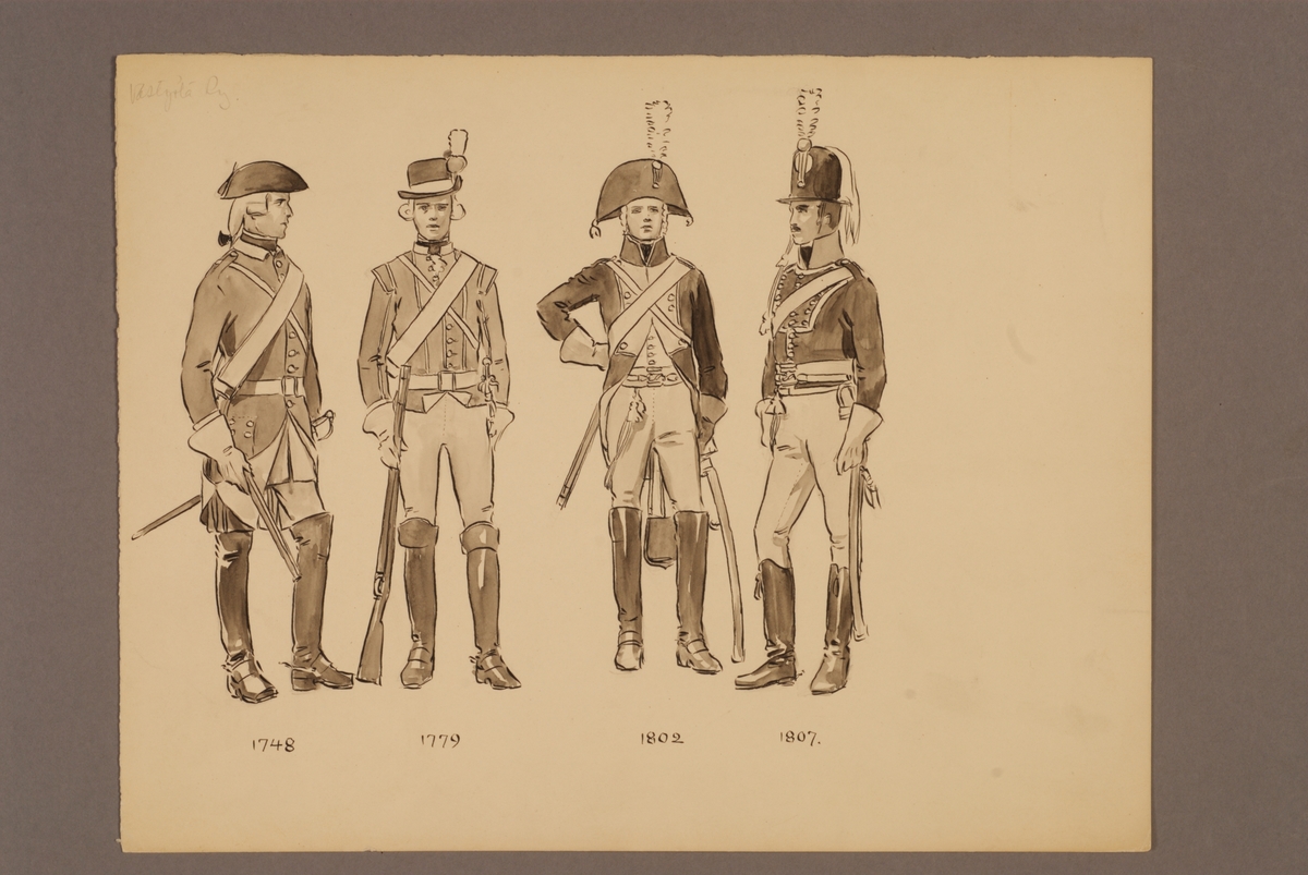 Plansch med uniform för Västgöta regemente för åren 1748-1807, ritad av Einar von Strokirch.
