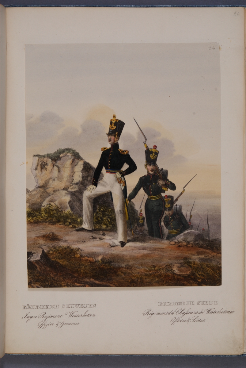 Plansch med uniform för officer och manskap vid Västerbottens fältjägarregemente. Ingår i planschsamlingen Das europäische Heer in charakteristischen Gruppen: Scweden, utgiven av Eckert und Monten ca 1840.