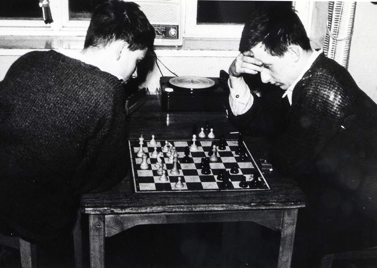 Stabsfurirskolan i Göteborg. Soldater spelar schack i logementet.