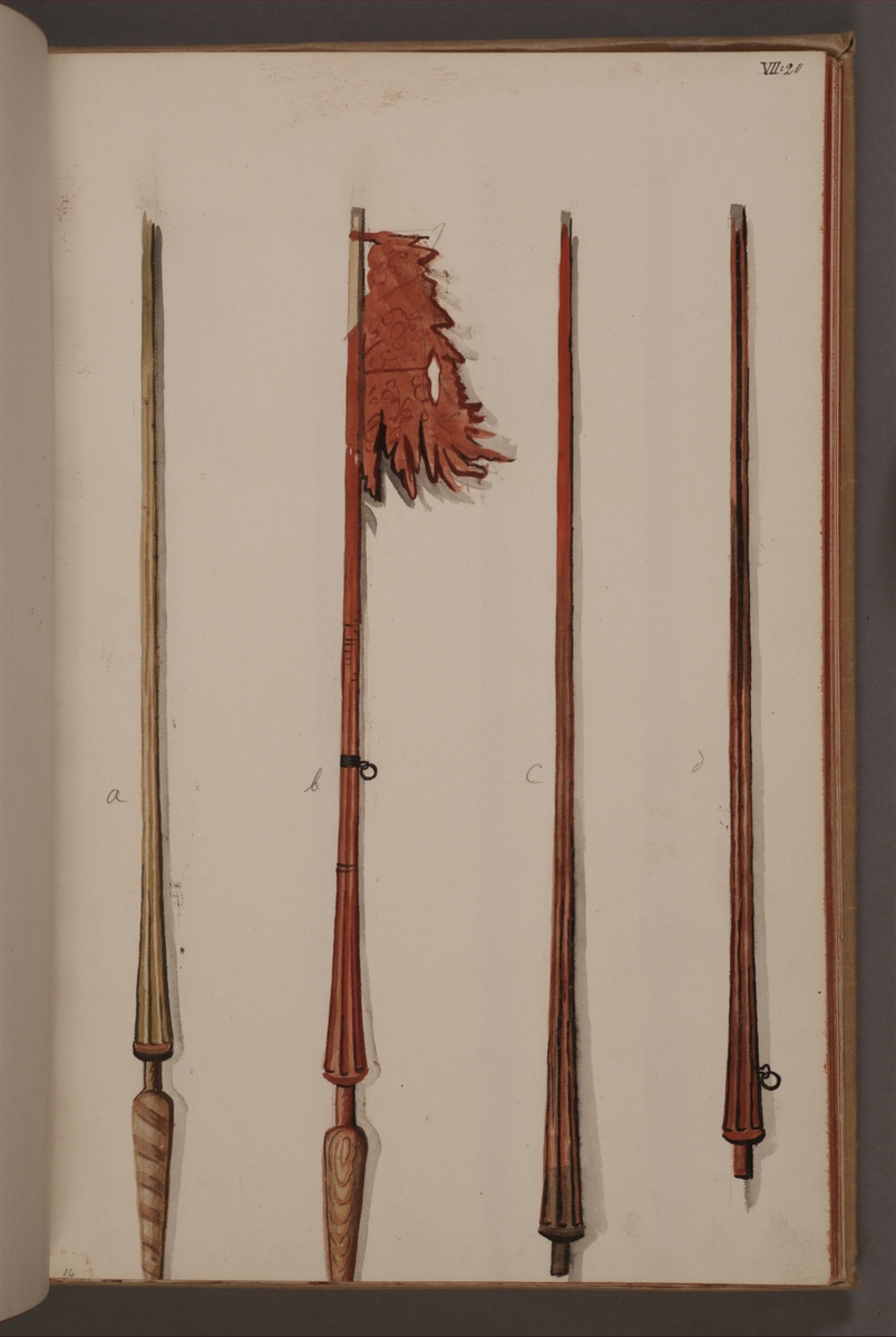 Avbildning i gouache föreställande standarstänger tagna som troféer av svenska armén. Stängerna längst till vänster och längst till höger i bild finns bevarade i Armémuseums samling, för mer information, se relaterade objekt.