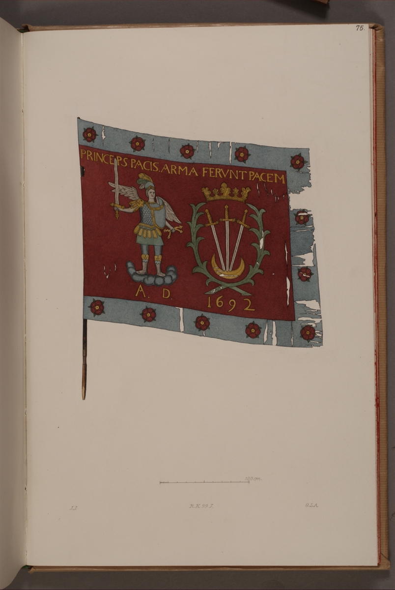 Titel: Avbildning i gouache föreställande fälttecken taget som trofé av svenska armén. Den avbildade fanan finns bevarad i Armémuseums samling, för mer information, se relaterade objekt.