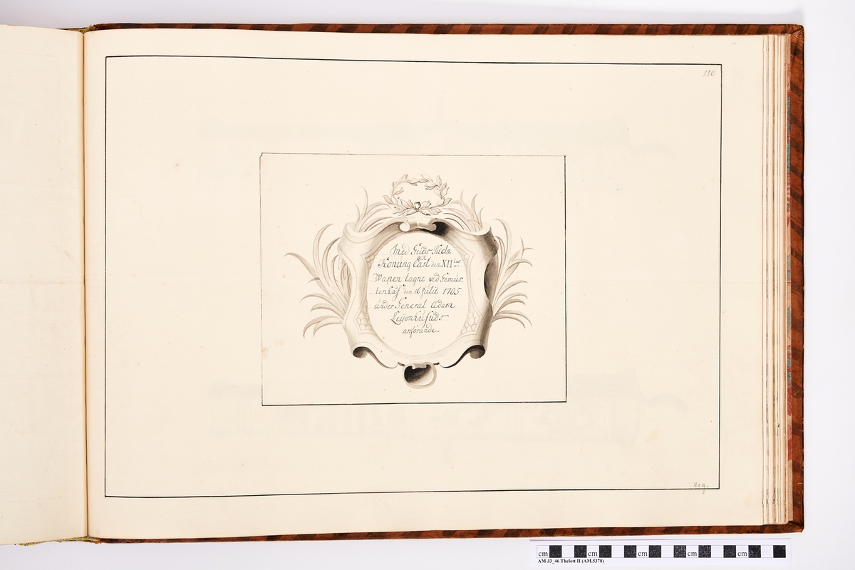 Kartusch till bokverk med avbildningar föreställande eldrör tagna som troféer av den svenska armén åren 1703-1706, utförda av syskonen Anna Maria och Philip Jakob Thelott. Avser troféer tagna vid Gemürtenhof den 16 juli 1705 under general Adam Leijonhufvuds (Lewenhaupt) anförande.