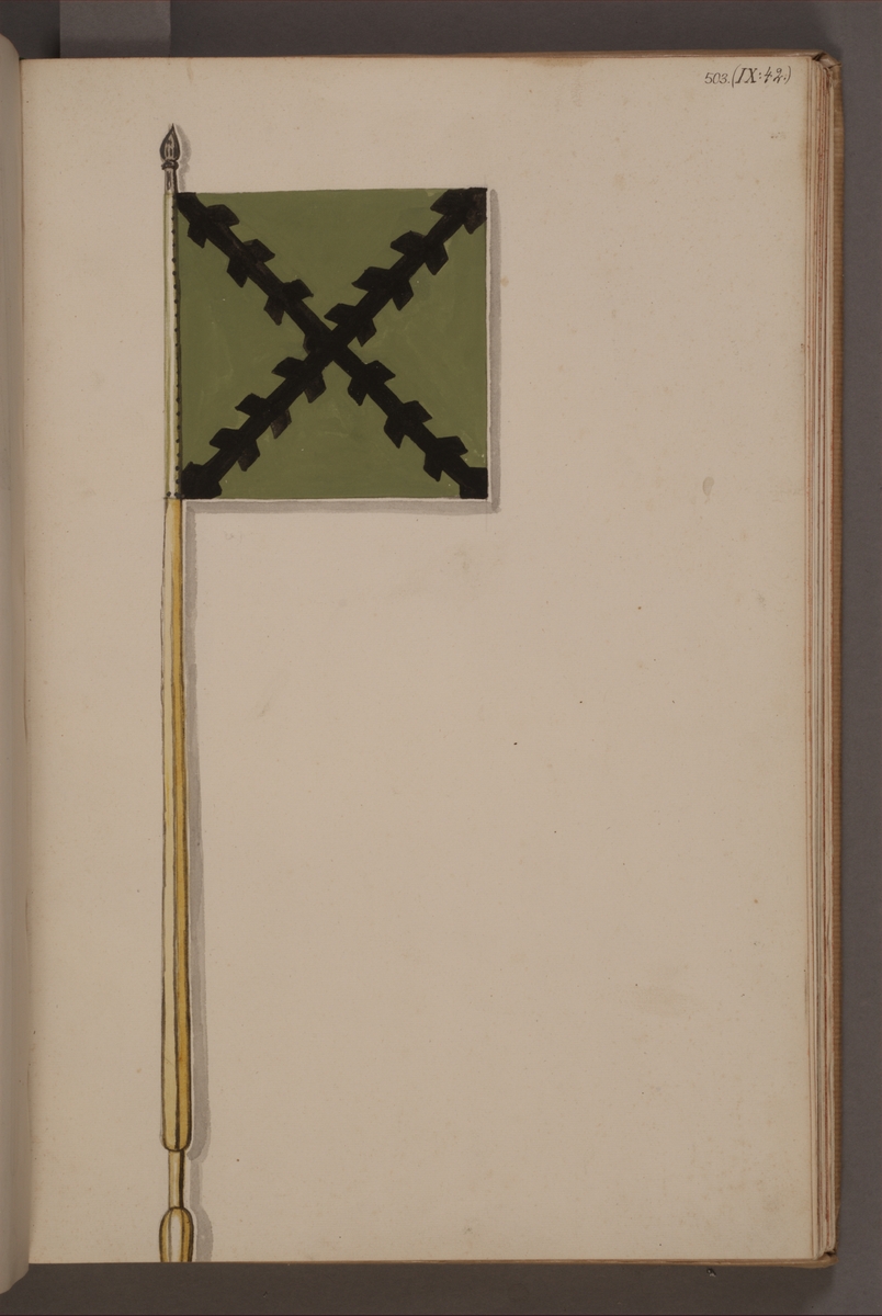 Avbildning i gouache föreställande fälttecken taget som trofé av svenska armén. Det avbildade standaret finns delvis bevarat i Armémuseums samling, för mer information, se relaterade objekt.