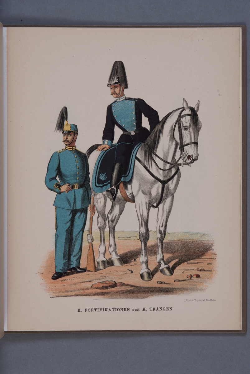 Plansch i färgtryck med uniform för Fortifikationen och Trängen. Ingår i boken Svenska arméns och flottans uniformer, utgiven av P.B Eklund 1891.