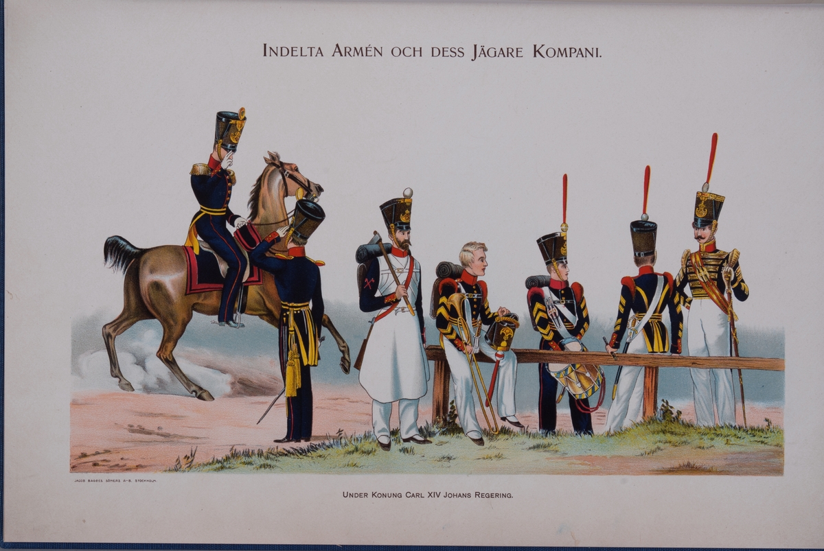 Plansch med uniform för indelta armén och dess jägarkompani under Karl XIV Johans regering. Ingår i boken Svenska krigsmakten under konungarna Carl XIV Johan, Oscar I, Karl XV, Oscar II, utgiven av P.B. Eklund.