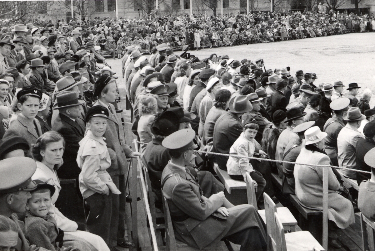 Titel: Publiken ser på vid uppvisningar på Arméns underofficersskola (Försvarets läroverk) i Uppsala 1949.