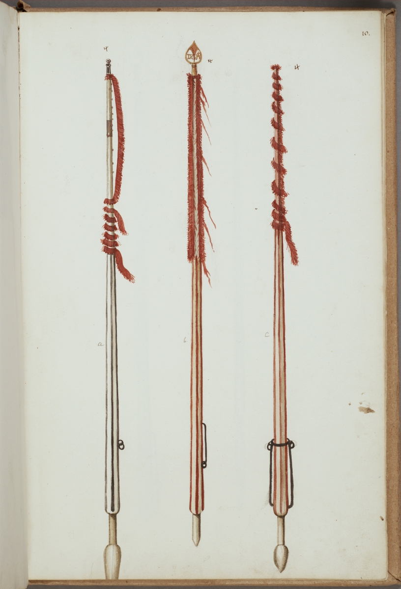 Avbildning i gouache föreställande fälttecken taget som trofé av svenska armén. De avbildade standarstängerna finns delvis bevarade i Armémuseums samling, för mer information, se relaterade objekt.