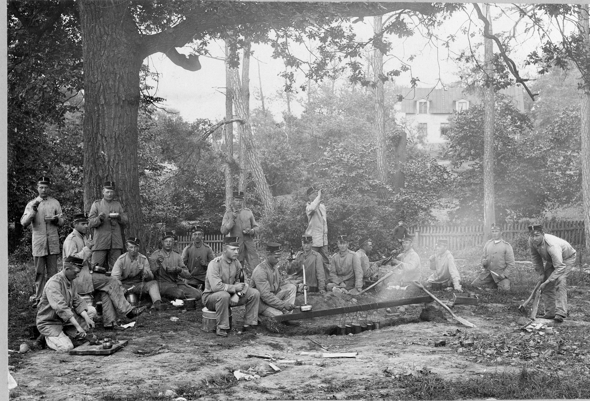 Soldater ur Göta livgarde I 2 äter och lagar mat i kokgrop i Sanda. I bakgrunden, vid staketet, står en ung pojke.