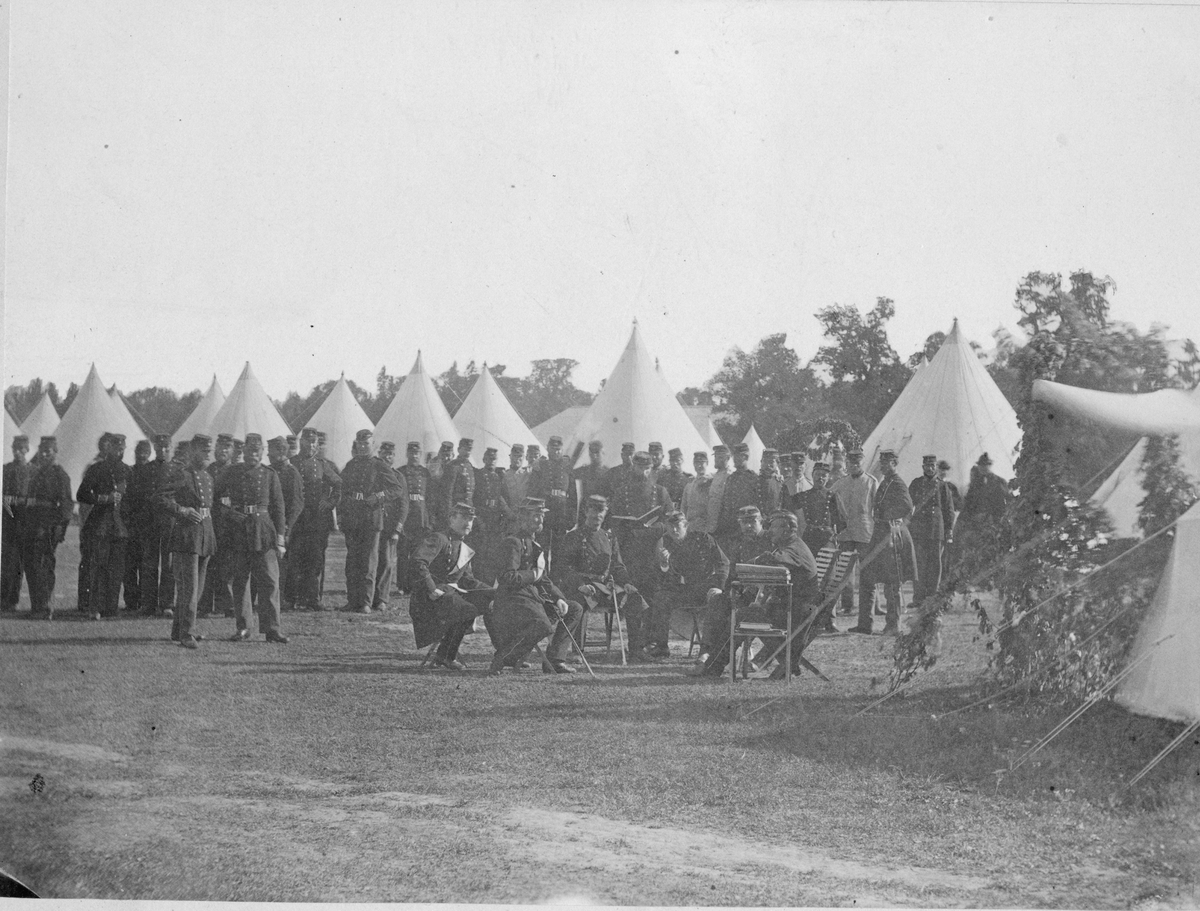 Soldater ur Västmanlands regemente I 18 samlade utanför tältläger vid Utnäs Löt vid tiden då Henrik Falkenberg var sekundchef. Sittande längst t.v. med uppknäppt syrtut: Zethelius, Holmén och längst till höger Wrangel.