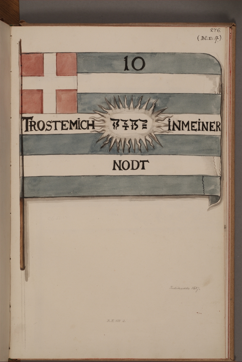 Titel: Avbildning i gouache föreställande fälttecken taget som trofé av svenska armén. Den avbildade fanan finns bevarad i Armémuseums samling, för mer information, se relaterade objekt.
