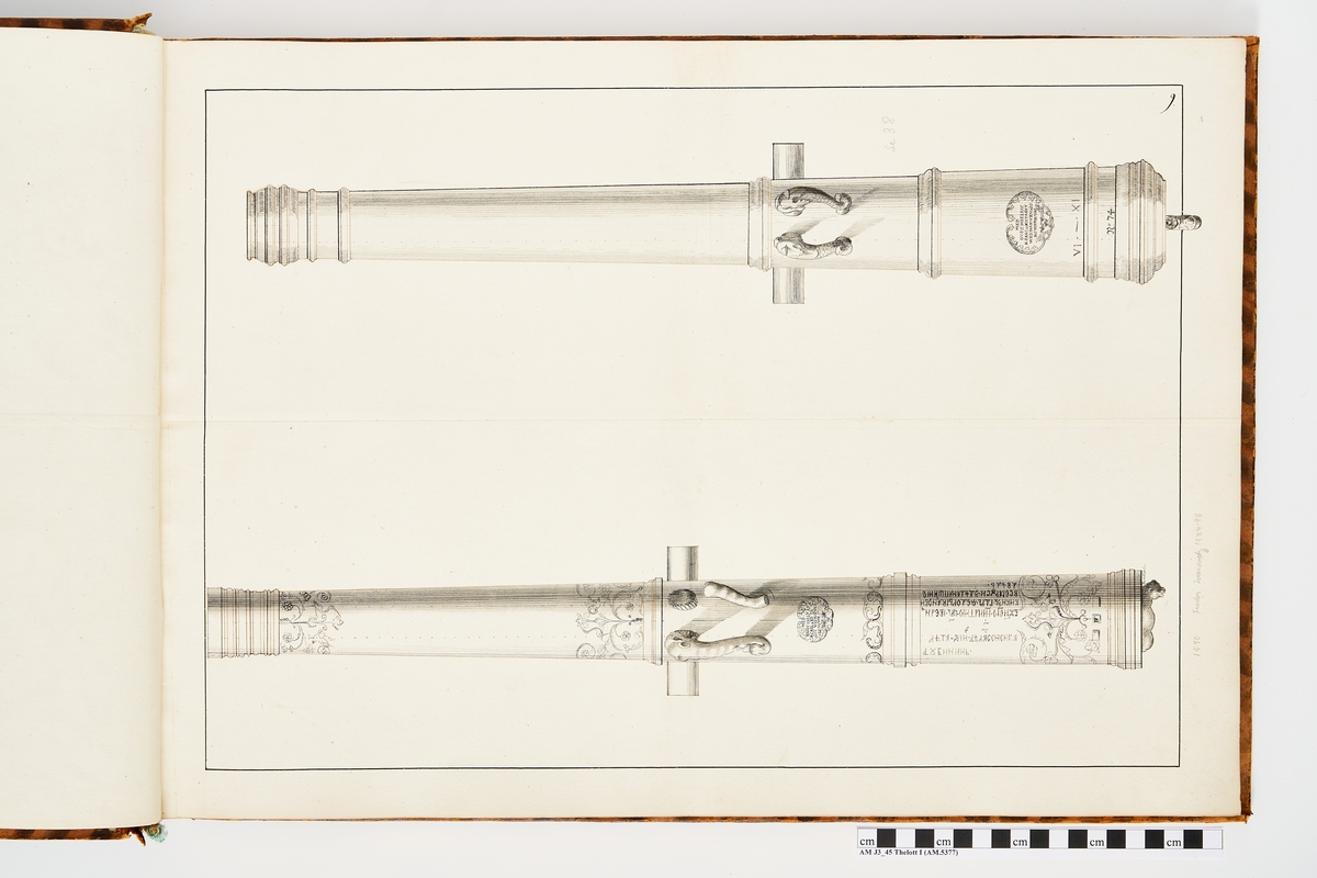 Avbildning föreställande eldrör tagna som troféer av den svenska armén i slaget vid Narva den 20 november 1700. Ingår i volym med avbildade kanontroféer tagna åren 1700-1702.