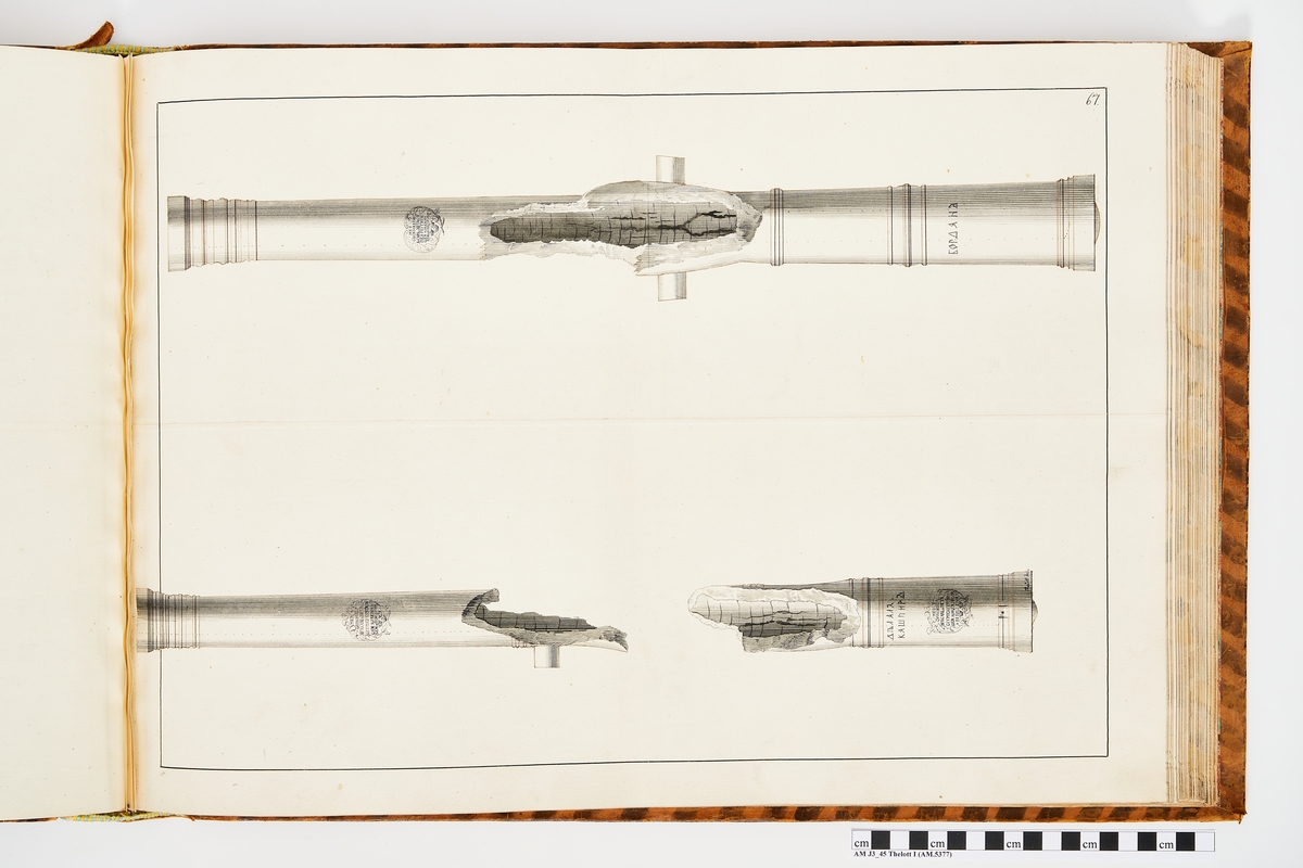 Avbildning föreställande eldrör tagna som troféer av den svenska armén med fästningen Kokenhusen 11 juli 1701. Ingår i volym med avbildade kanontroféer tagna åren 1700-1702.