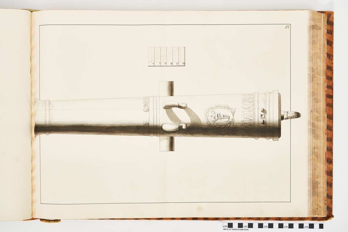 Avbildning föreställande dansk trofé med Frederik III:s vapen. Ingår i volym med avbildade äldre svenska eldrör förvarade på fästningar samt eldrör erövrade åren 1598-1679.