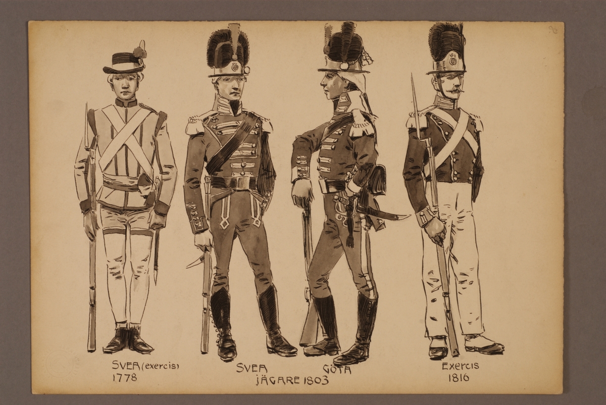 Plansch med uniform för Svea livgarde och Göta livgarde för, ritad av Einar von Strokirch.
