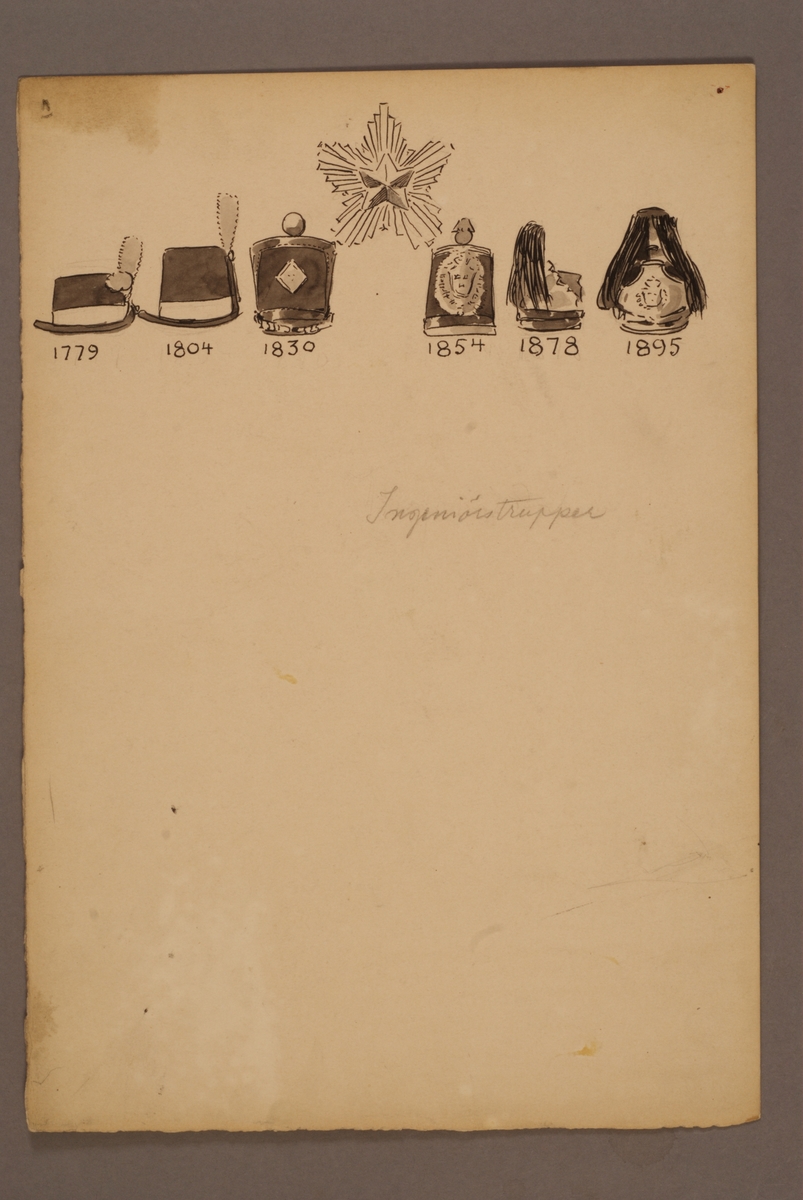 Plansch med huvudbonader för Ingenjörstrupper för åren 1779-1895, ritad av Einar von Strokirch.