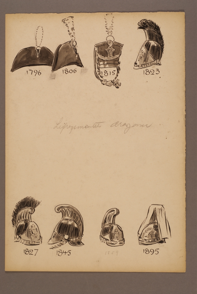 Plansch med huvudbonader för Livregementets dragoner för åren 1796-1895, ritad av Einar von Strokirch.