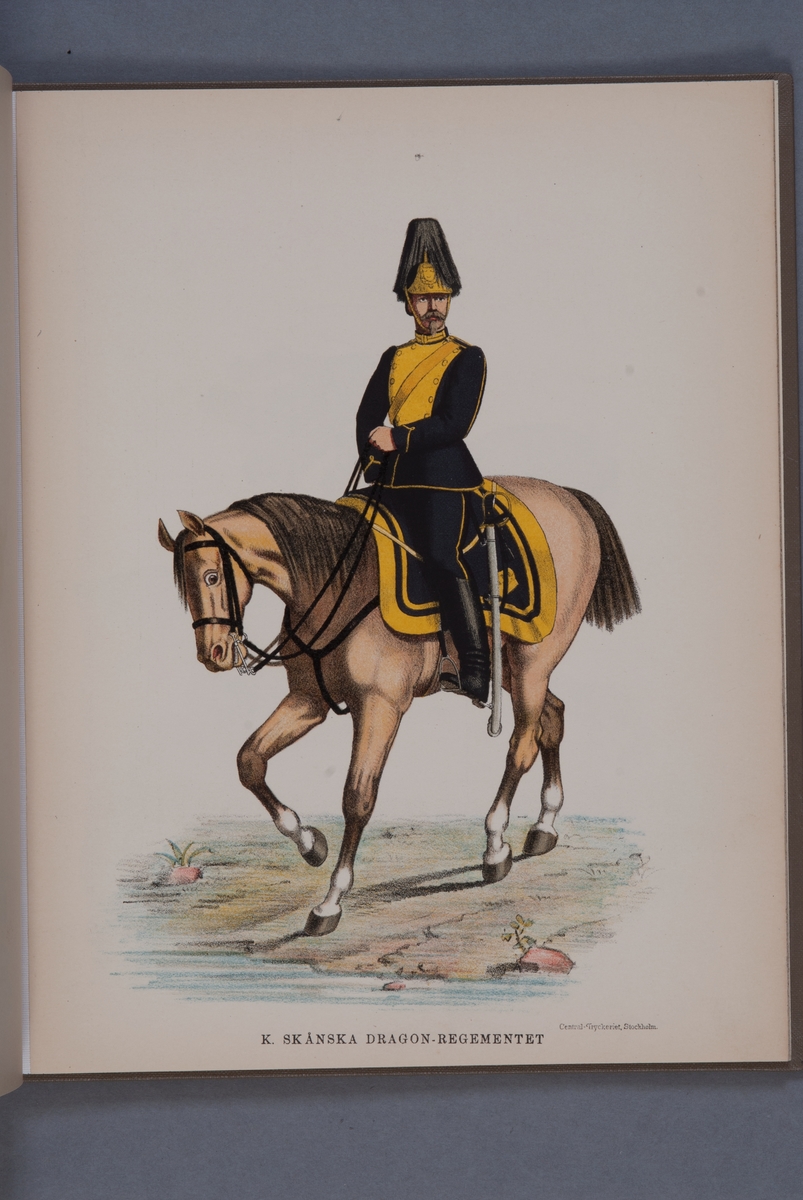 Plansch i färgtryck med uniform för Skånska dragonregementet. Ingår i boken Svenska arméns och flottans uniformer, utgiven av P.B Eklund 1891.