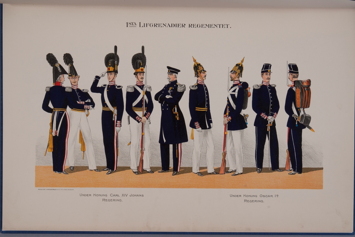 Plansch med uniform för Första livgrenadjärregementet under Karl XIV Johans regering och Oscar I regering. Ingår i boken Svenska krigsmakten under konungarna Carl XIV Johan, Oscar I, Karl XV, Oscar II, utgiven av P.B. Eklund.