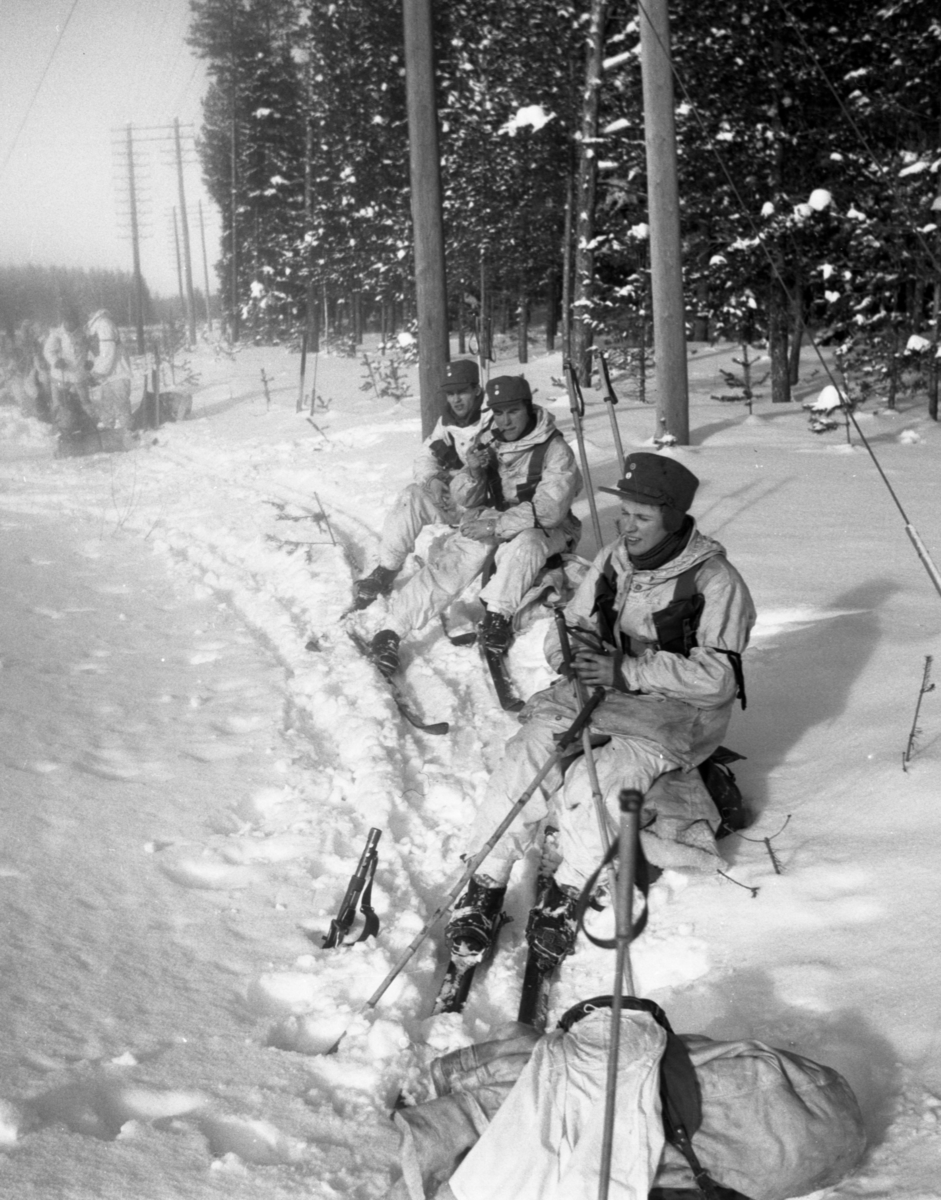 Soldater på rast under vinterövning. Värnplikt vid Norrlands dragonregemente K4, Umeå, 1955-1956.