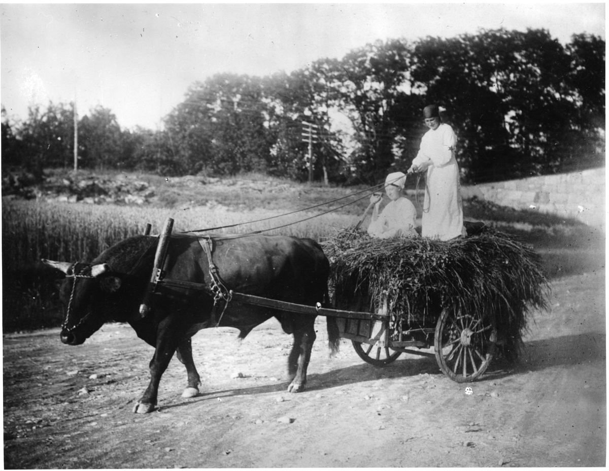 Titel: Två kvinnor ur Röda Stjärnan i tvåhjulig höskrinda dragen av tjur på landsväg.