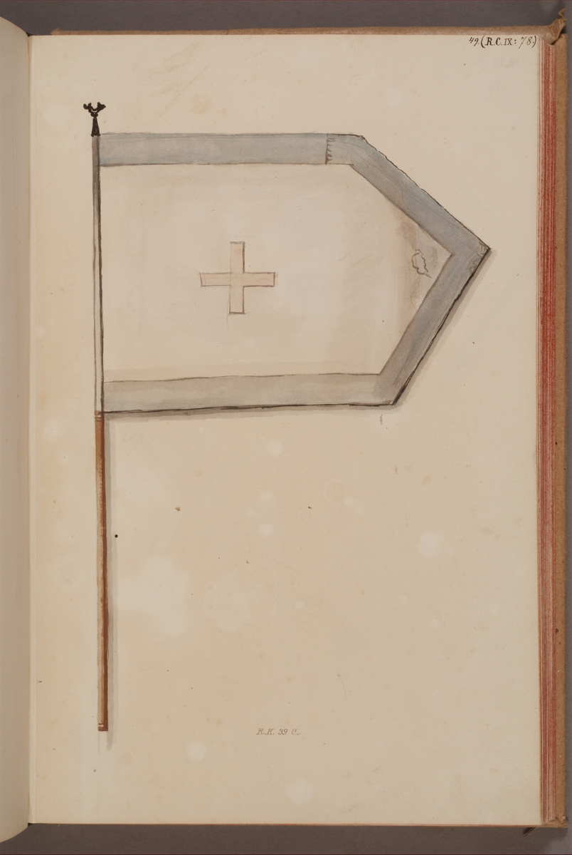 Titel: Avbildning i gouache föreställande fälttecken taget som trofé av svenska armén. Den avbildade fanan finns bevarad i Armémuseums samling, för mer information, se relaterade objekt.