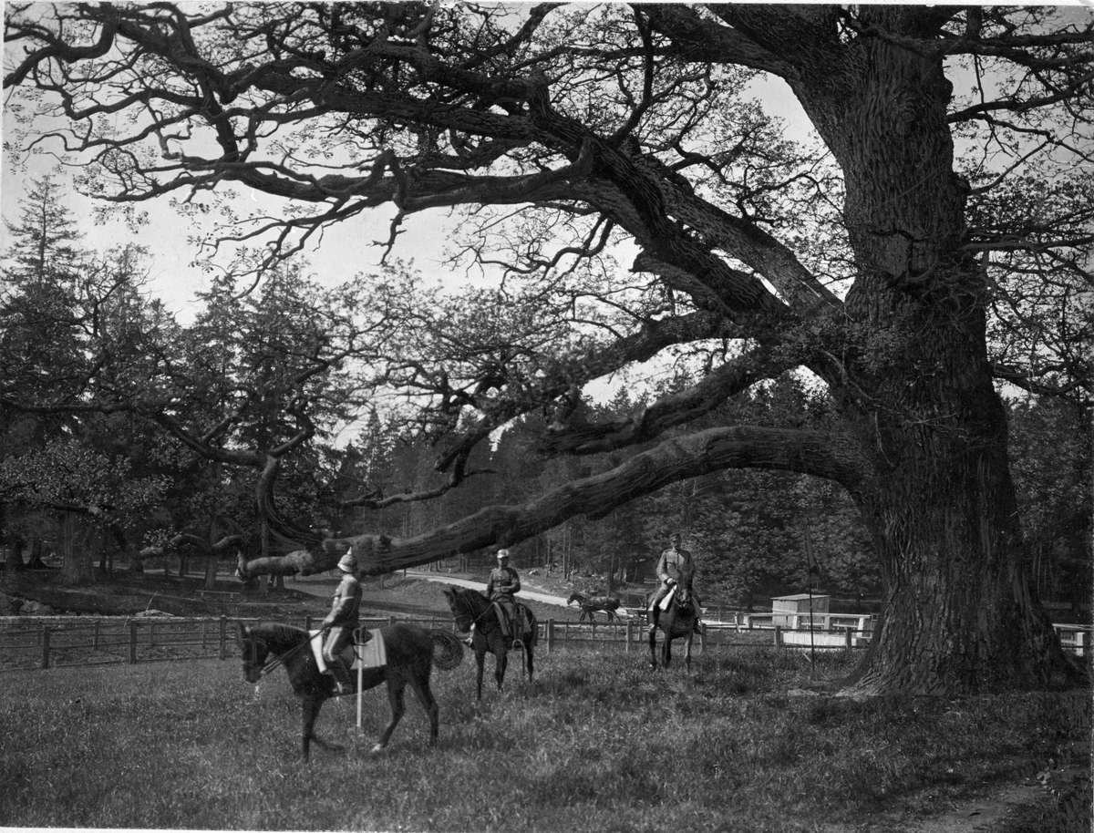 Tre ryttare från Livregementet till häst K 1 rider under ett stort träd på Lindarängen, Stockholm år 1904. Handkolorerat fotografi.