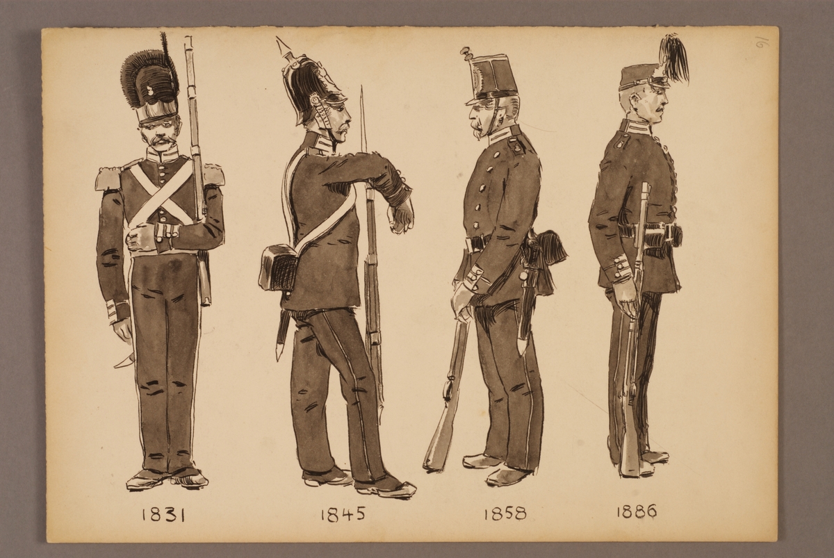 Plansch med uniform för Andra livgrenadjärregementet för åren 1831-1886, ritad av Einar von Strokirch.