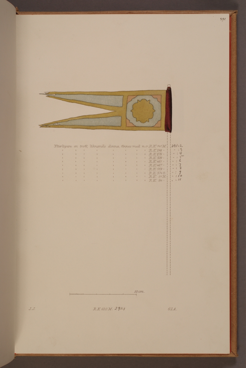 Avbildning i gouache föreställande fälttecken taget som trofé av svenska armén. Den avbildade lansfanan finns bevarad i Armémuseums samling, för mer information, se relaterade objekt.