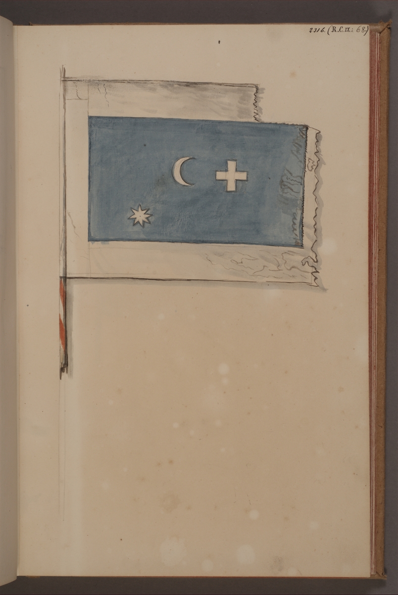 Titel: Avbildning i gouache föreställande fälttecken taget som trofé av svenska armén. Den avbildade fanan finns bevarad i Armémuseums samling, för mer information, se relaterade objekt.