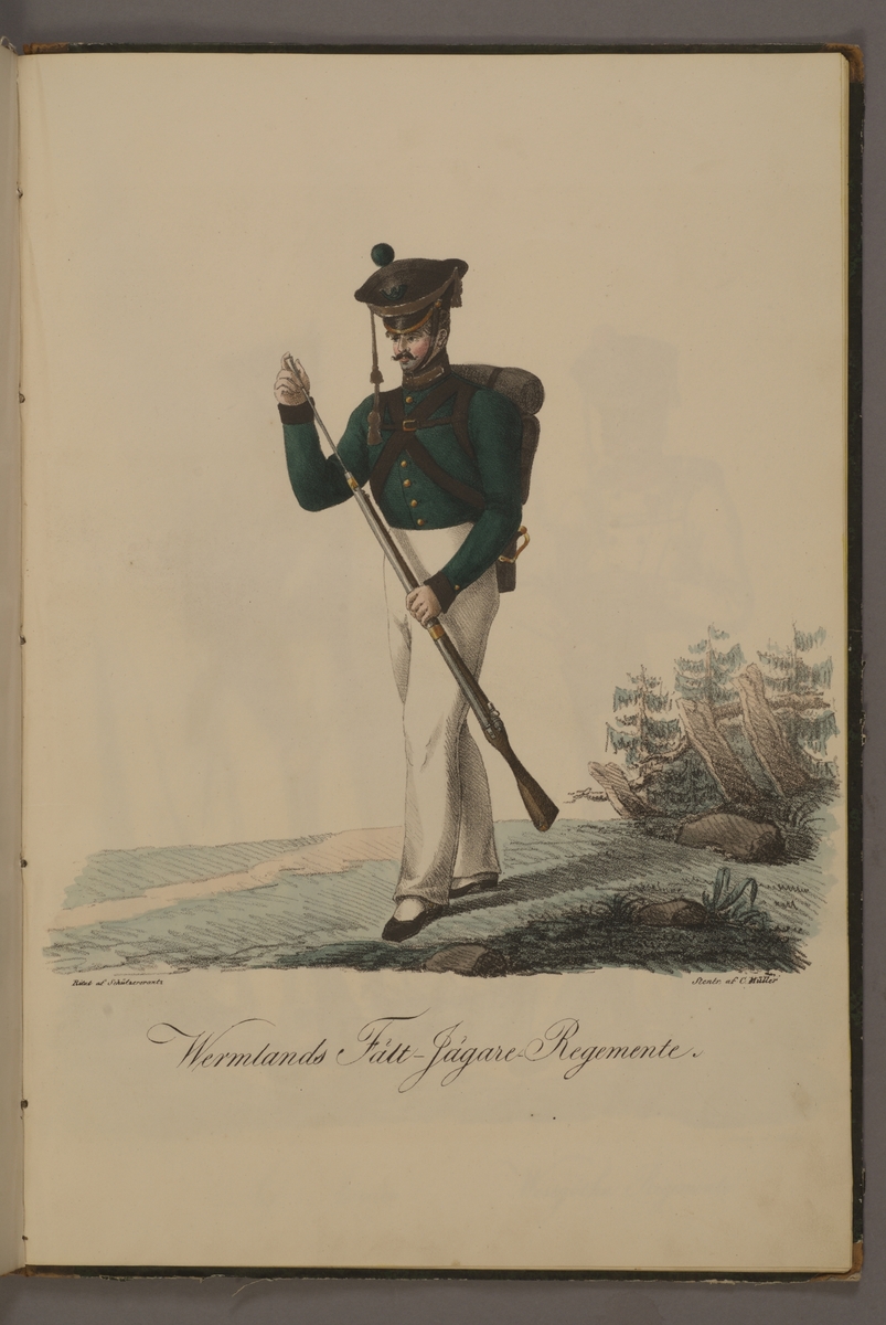 Plansch med uniform för Värmlands fältjägarregemente. Handkolorerad litografi efter original av Adolf Ulrik Schützercrantz. Ingår i planschsamlingen Kongliga svenska arméens uniformer utgiven som stentryck av Müller 1825.