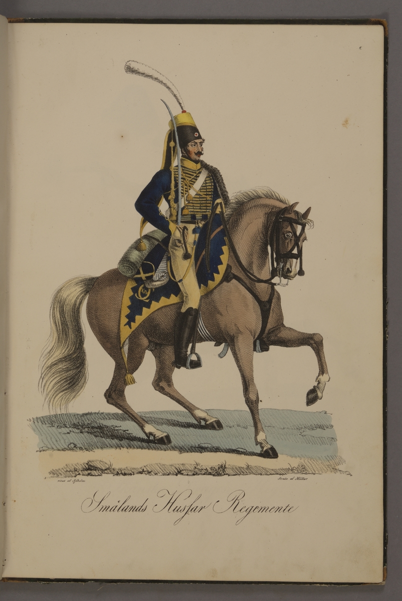 Plansch med uniform för Smålands husarregemente . Handkolorerad litografi efter original av Johan Sjöholm. Ingår i planschsamlingen Kongliga svenska arméens uniformer utgiven som stentryck av Müller 1825.