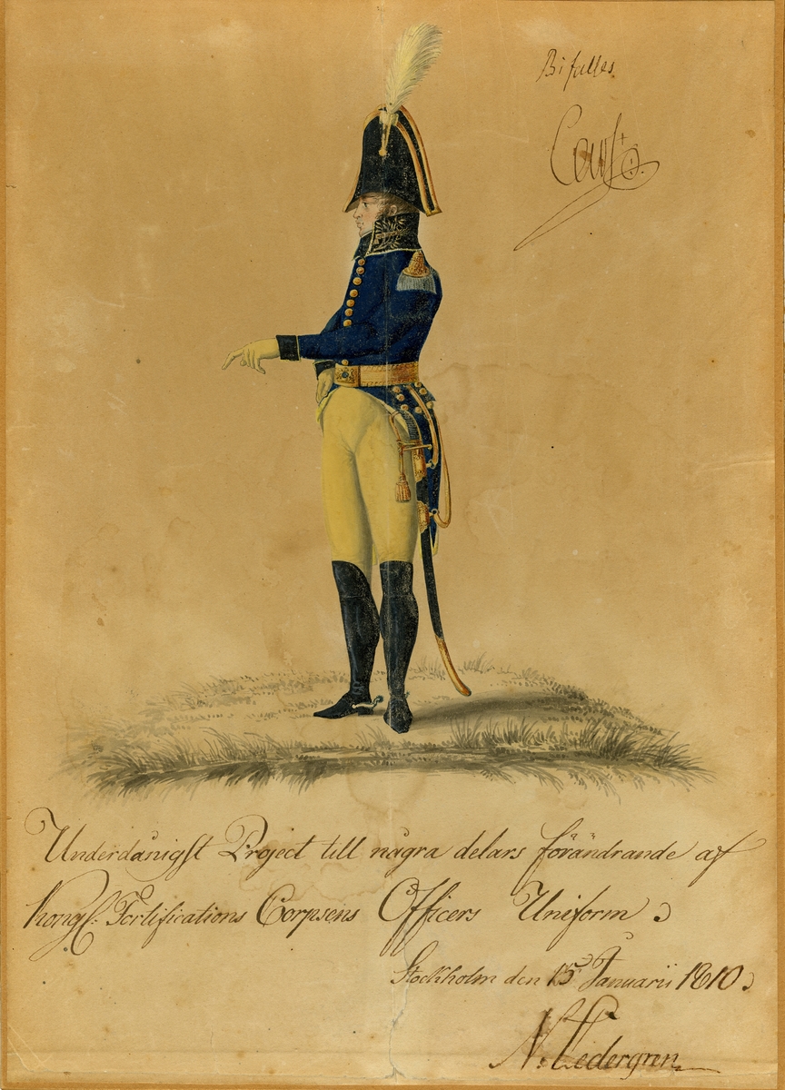 Akvarell med uniformsskiss för Fortifikationsstaten. "Underdånigt projekt till några delars förändrande av Kungliga Fortifikationskårens officersuniform" 1810.