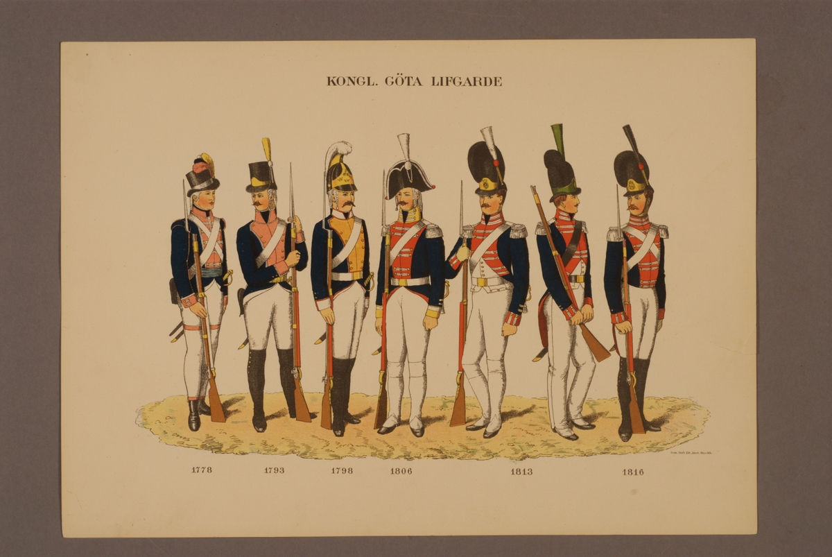Plansch i färgtryck med uniform för Göta livgarde för åren 1778-1816. Ingår i planschsamlingen Svenska krigsmaktens fordna och nuvarande munderingar utgiven av P.B Eklund 1900-1905.