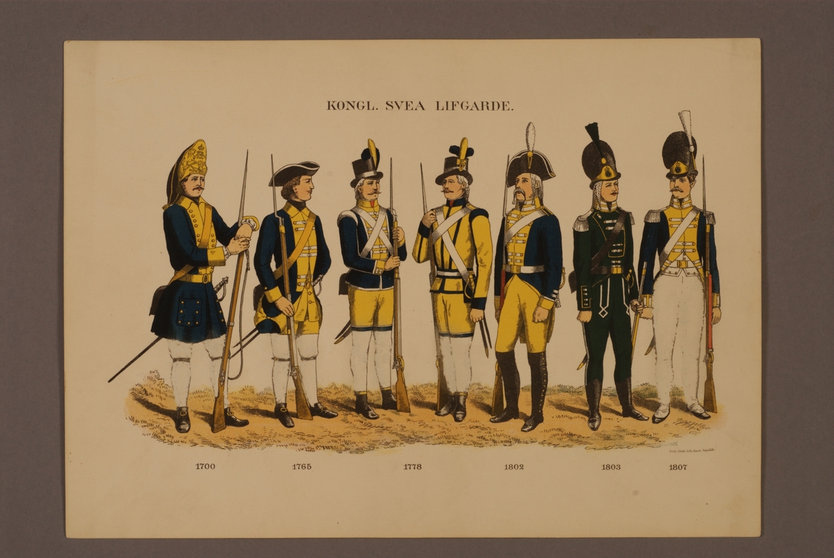 Plansch i färgtryck med uniform för Svea Livgarde för åren 1700-1807. Ingår i planschsamlingen Svenska krigsmaktens fordna och nuvarande munderingar utgiven av P.B Eklund 1900-1905.