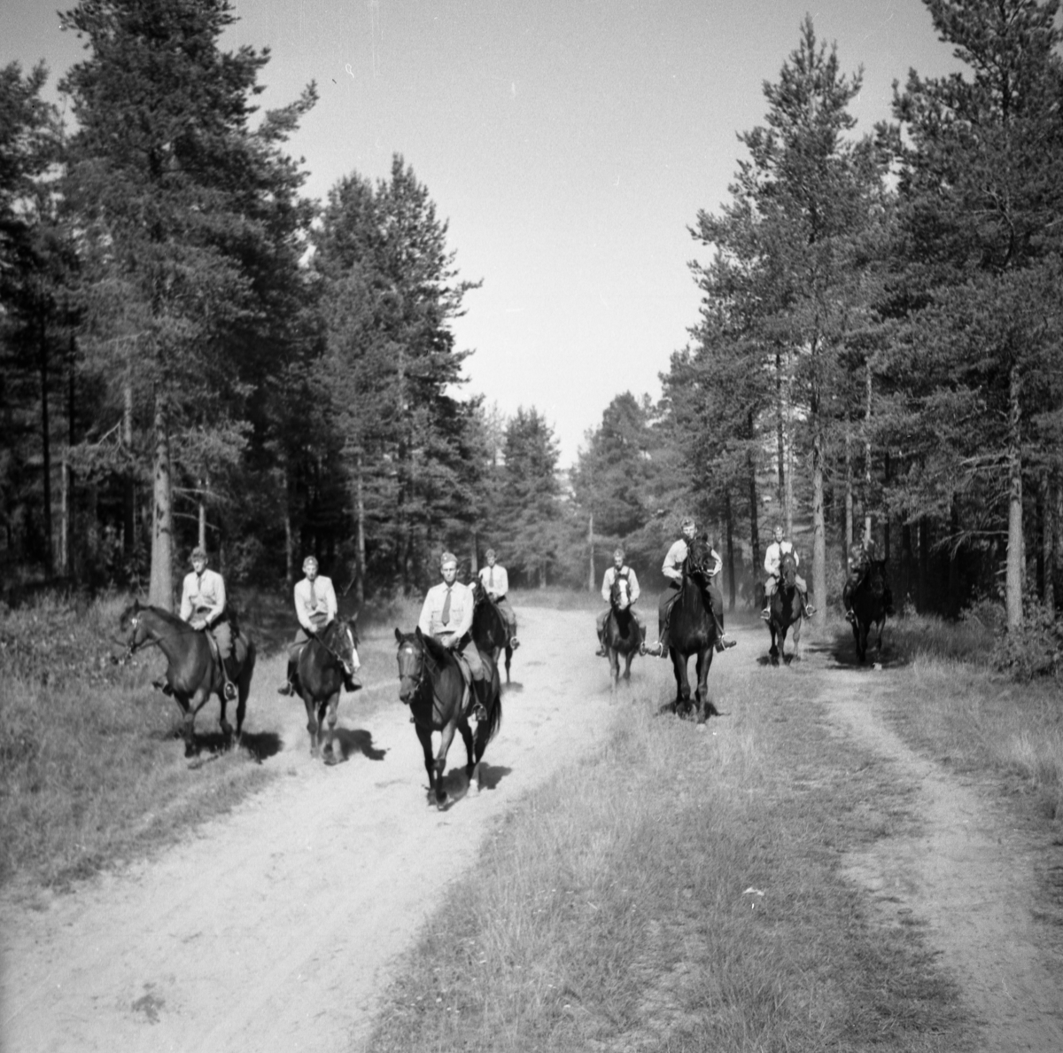 Ridtur på skogsvägen med värnpliktiga från Norrlands dragonregemente K4, Umeå, 1955-1956.