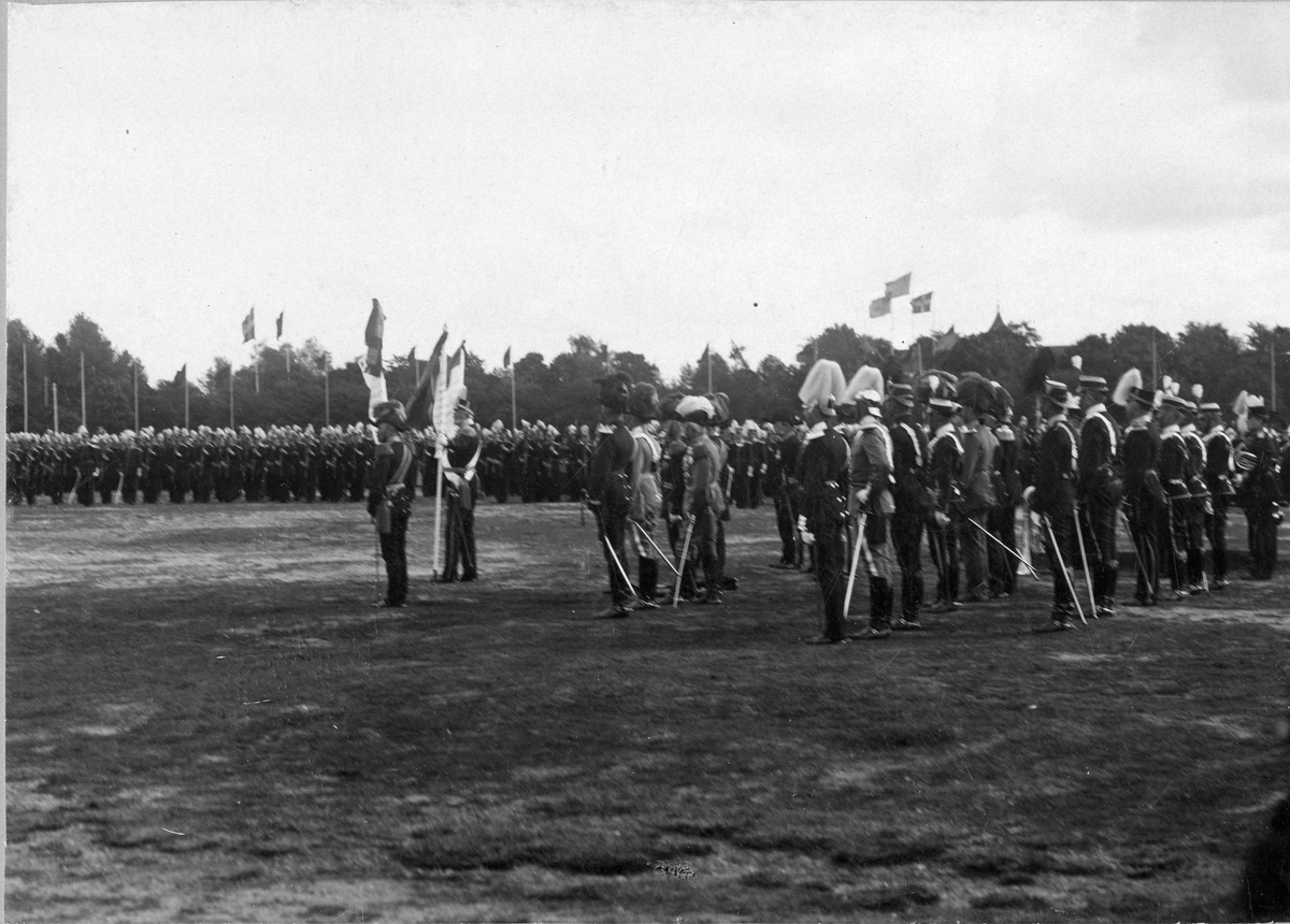 Kung Oscar II överlämnar nya fanor till Livregementets grenadjärer I 3 på Sanna hed. I bakgrunden syns officerspaviljongen.
