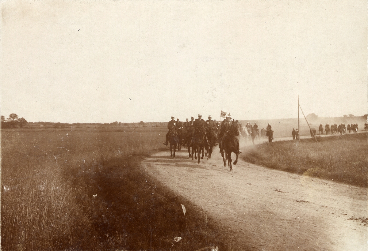 Kavalleritrupp galopperar fram på grusväg. Civila åskådare tittar på vid sidan om.