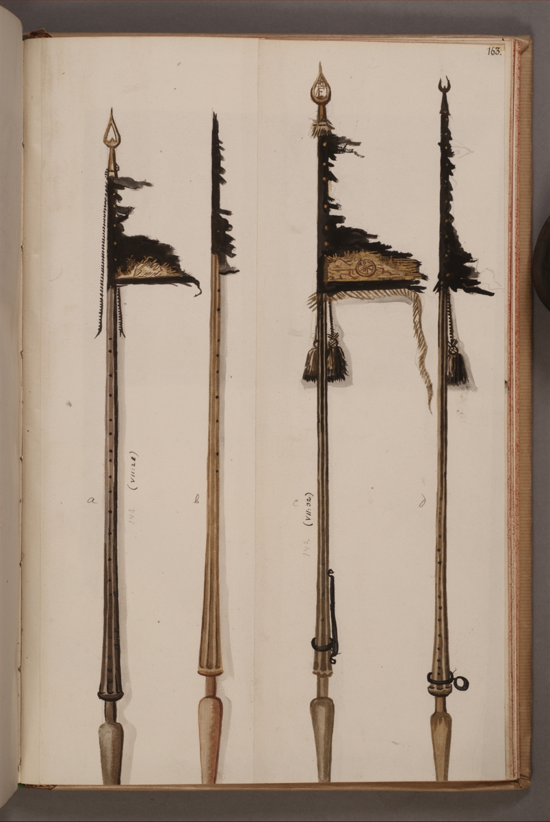 Avbildning i gouache föreställande fälttecken tagna som troféer av svenska armén. Standaret näst längst till höger i bild finns bevarat i Armémuseums samling, för mer information, se relaterade objekt.