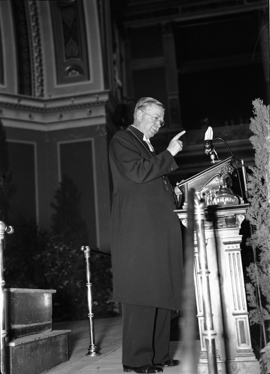 Biskop Tor Andrae talar på högtidsmöte i Universitetsaulan vid folkskolejubileets och sjunde uppländska skolmötets första dag