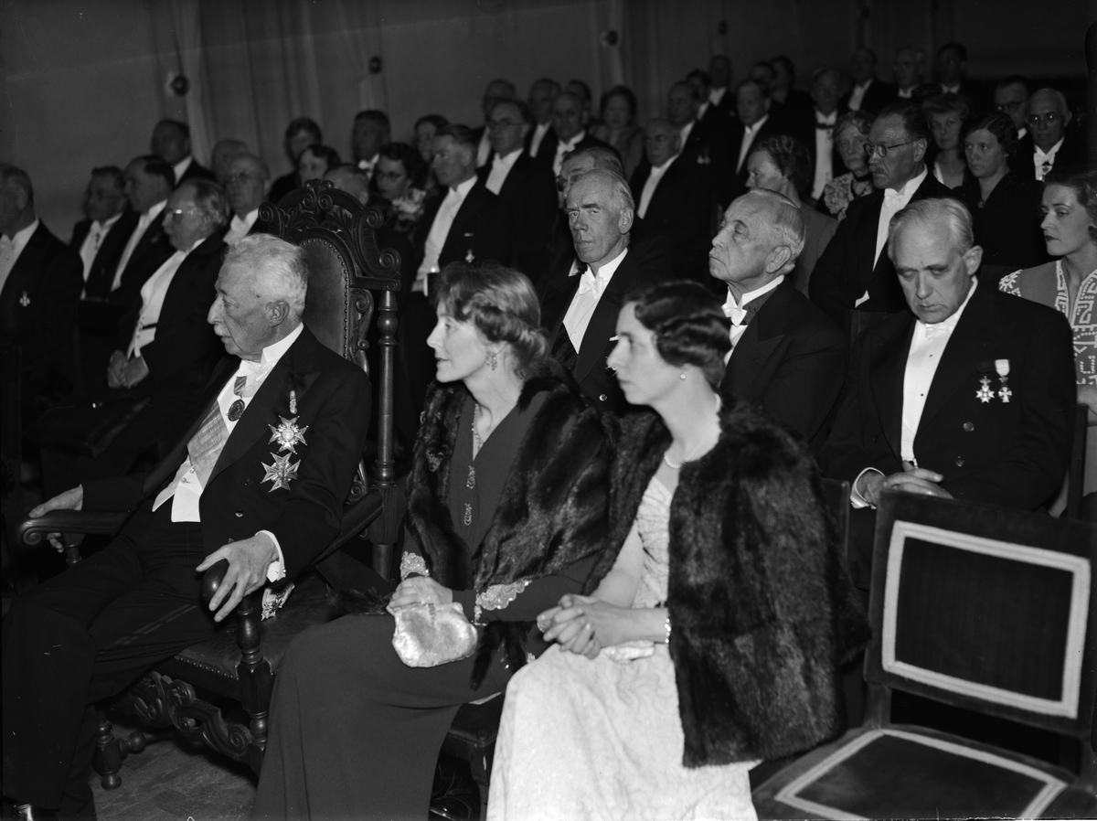 "Gustav Adolfsakademien firade glansfullt sitt tioårsjubileum" - prins Eugen, "fruarna" Westman och Sahlgren samt professor Nils Ahnlund, högtidssammanträdet på Värmlands studentnation, Uppsala november 1942