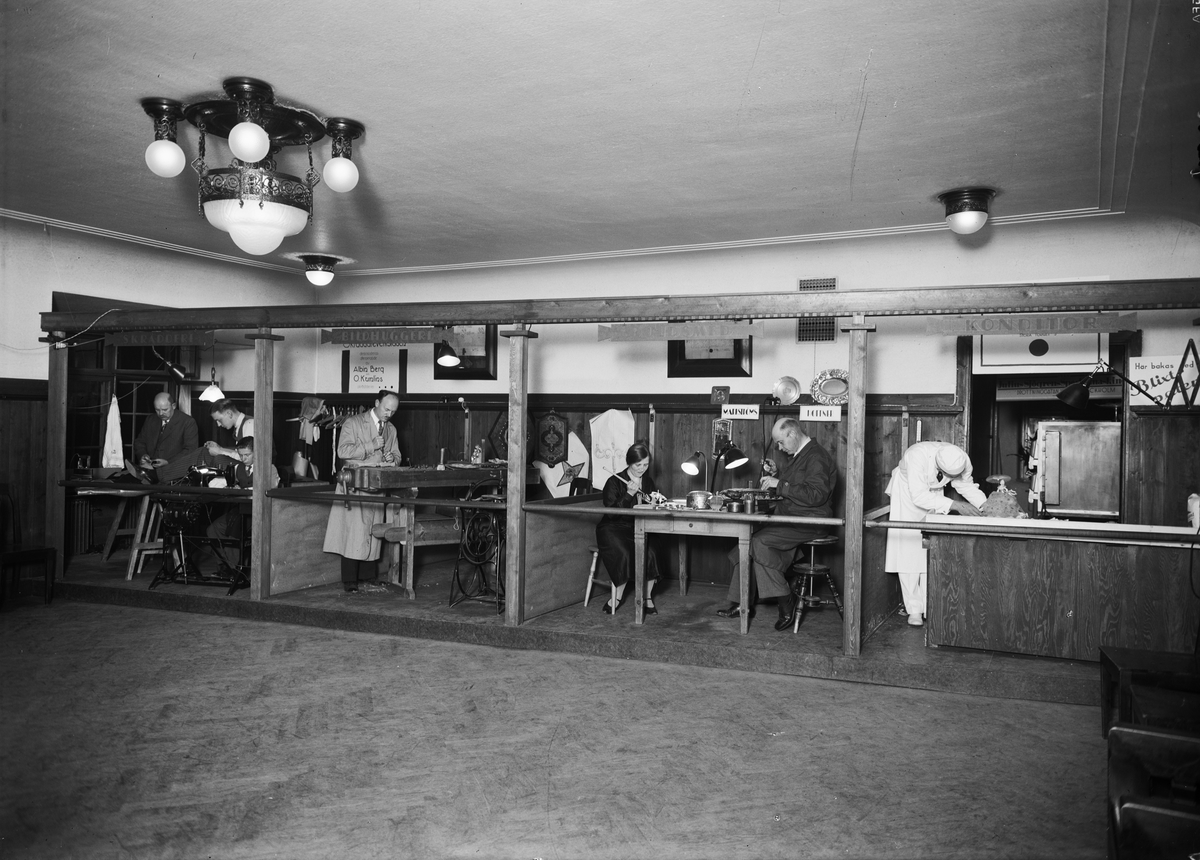 Skräddare, snickare, guldsmeder och konditor i en s k arbetande verkstad i föreningens representationsrum under Upsala Fabriks- och handtverksförenings utställning, Nedre Slottsgatan 6