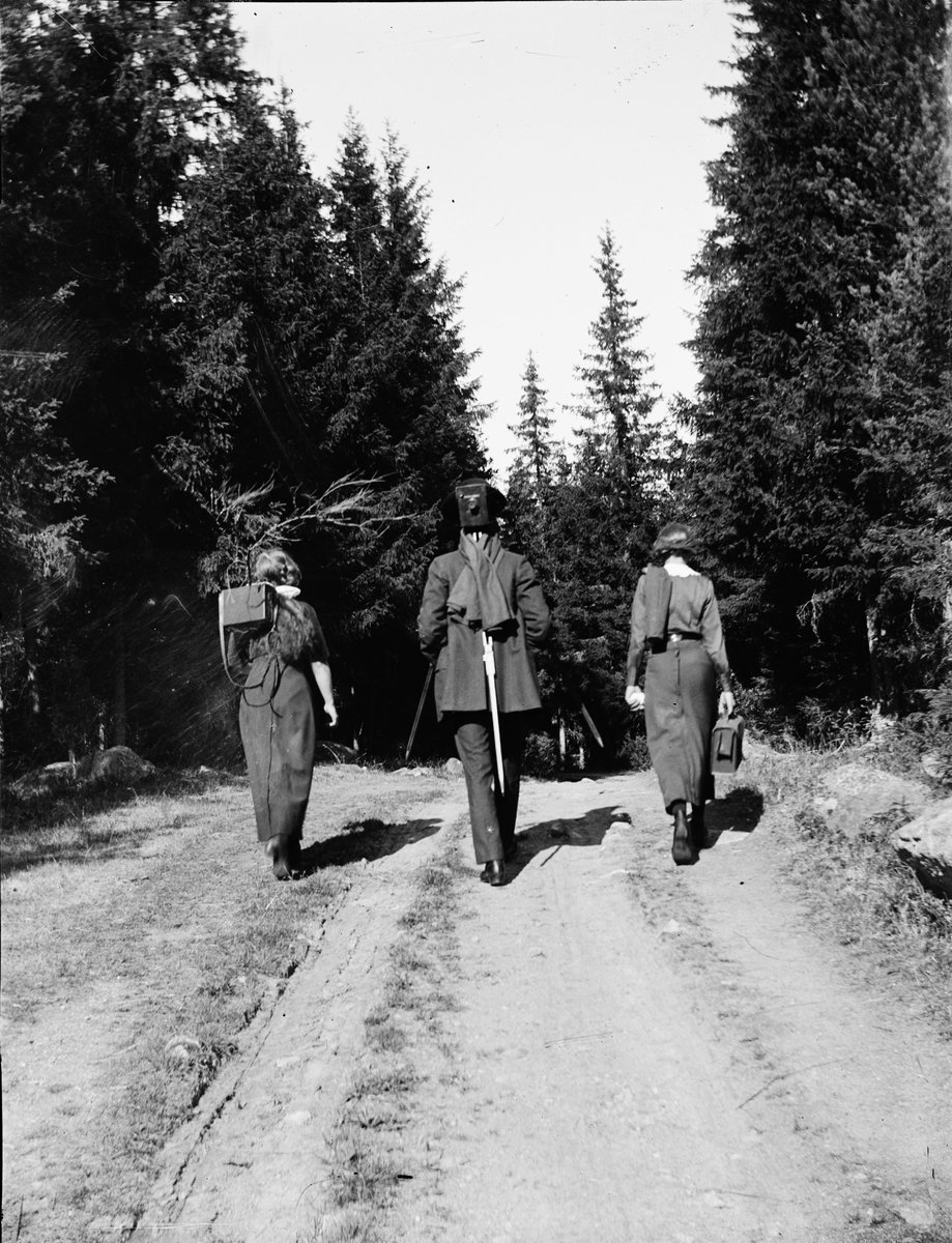 Syskonen Edhlund går bortåt på skogsväg, Östhammar, Uppland