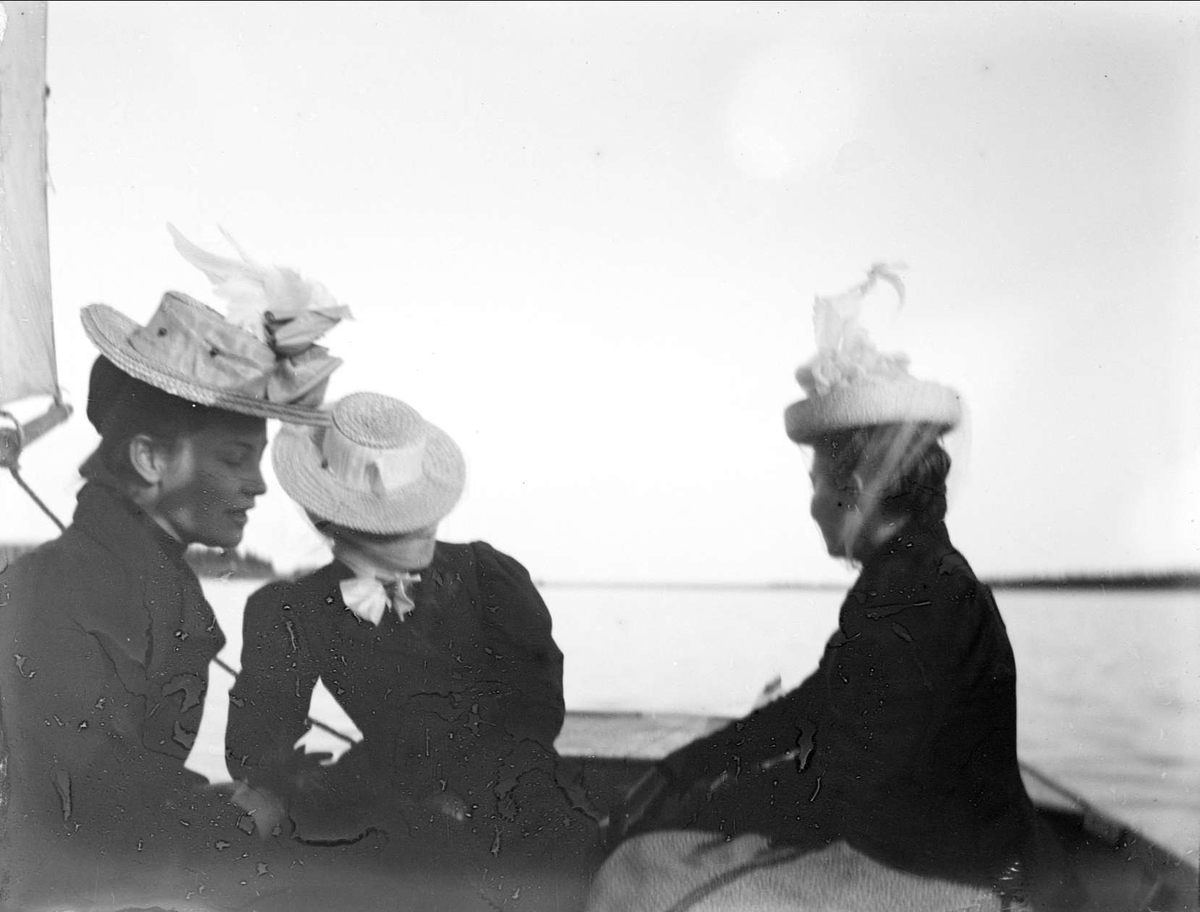 Tre unga kvinnor i båt, sannolikt på Ekoln, Uppland
