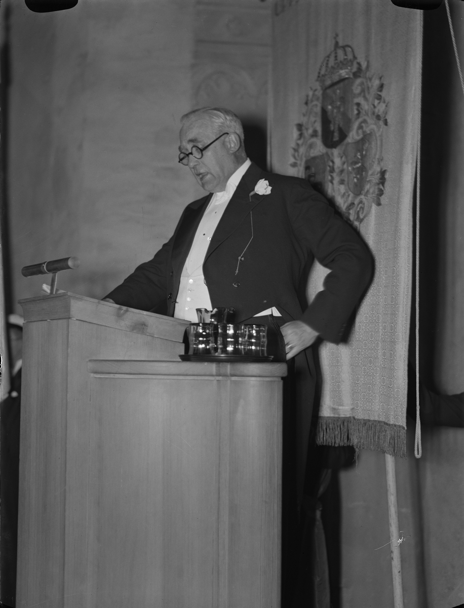 Professor Nils Ahnlund högtidstalar på Uppsala Studentkårs vårfest i Rikssalen, Uppsala slott