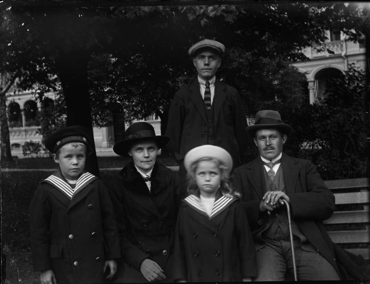 Kvinna, man och barn sitter och står vid en parkbänk, Uppsala