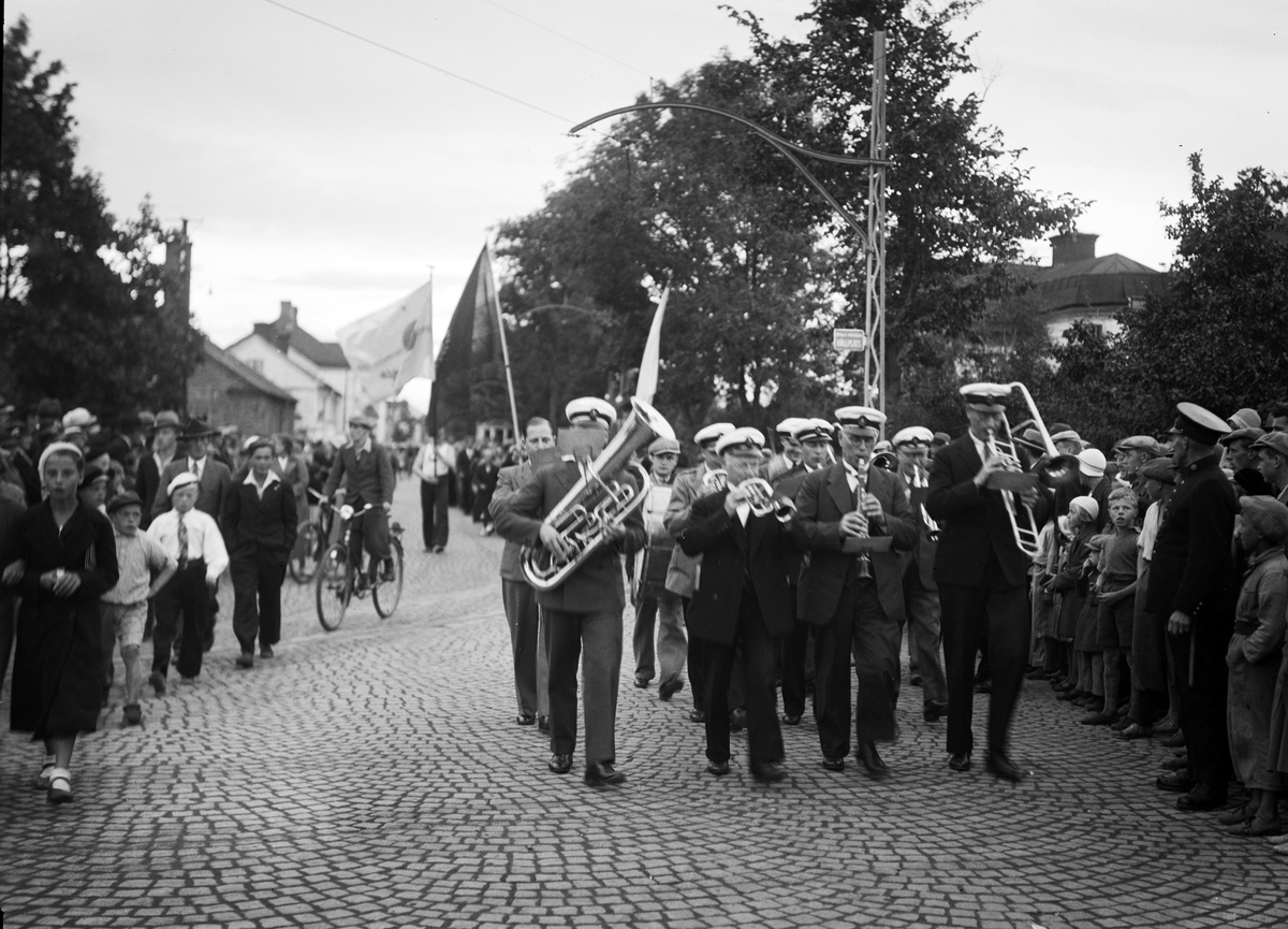 "Idrottstruppen på väg till festplatsen" för Uppsala första idrottsmässa, Svartbäcken