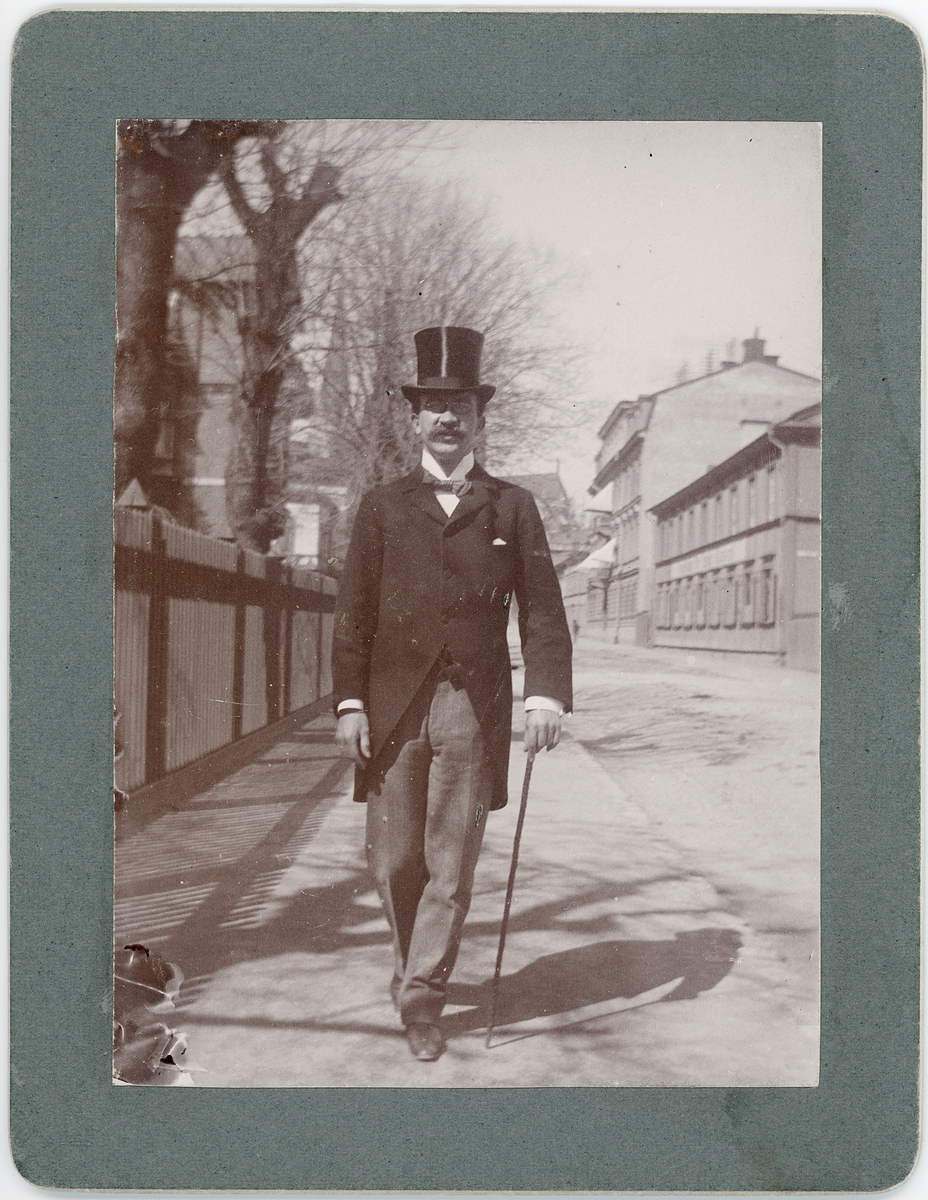 En man i hög hatt och käpp promenerar på Trädgårdsgatan, Uppsala