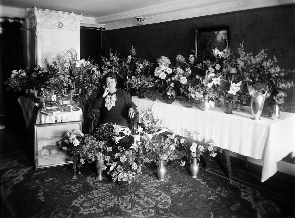 Hildi Nilsson omgiven av blommor, Östhammar, Uppland