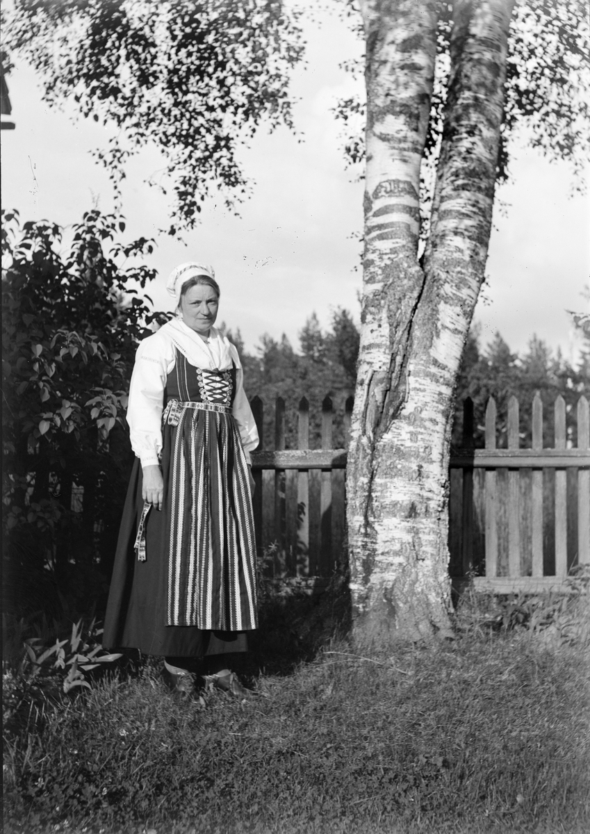 Christiane Liljefors, iklädd folkdräkt, troligen Leksandsdräkt, står vid björkar, Dalarna